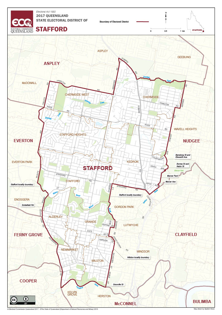 Stafford is in the inner north of Brisbane, and takes in the suburbs of Chermside, Stafford, Stafford Heights, Grange, Wilston and parts of Chermside West, Wavell Heights, Alderley and Newmarket.